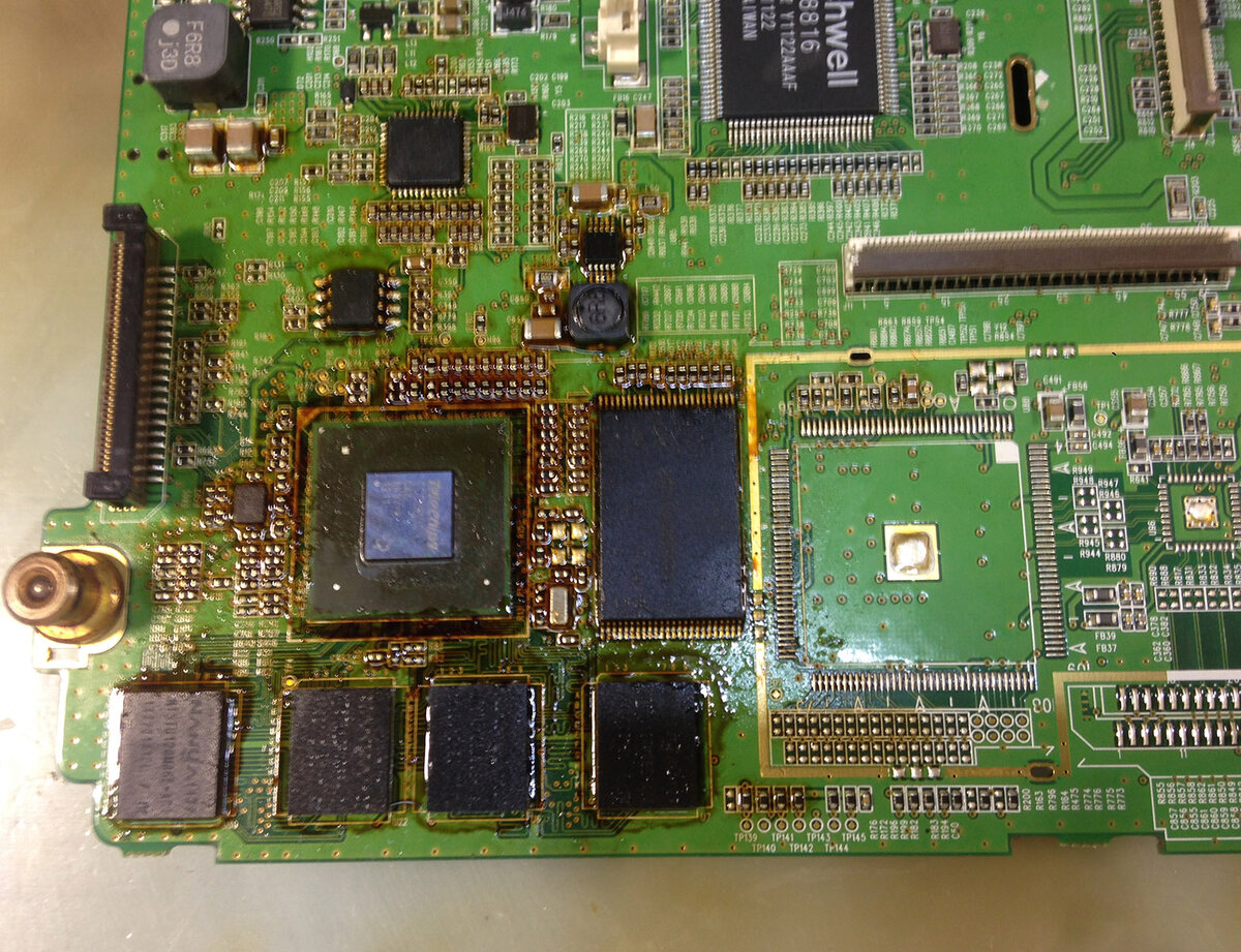 Автомагнитолы MOTREX (MTXT900), для KIA Sorento, Hyundai Santa Fe, KiA Quoris, Hyundai Equus, очень часто попадают в ремонт с парой типовых неисправностей: отвал кристалла процессора и неисправность NAND памяти. Автомагнитола включается, тёмный экран, задняя камера работает. Либо Автомагнитола включается и зависает на логотипе. Но данный случай оказался не совсем стандартным. Магнитолу принесли с жалобой что не работает. После вскрытия обнаружил такую картину: Так же со слов клиента после предыдущей попытки ремонта отказала и задняя камера. Не удивительно, хотя и не обычно. Камера должна работать. Для начала устраню ужас и поменяю процессор на новый. Ставлю плату на термостол и снимаю чип Чищу плату от остатков припоя и запечёного канифольного флюса Восстанавливаю оторванные из-за локального перегрева пятаки под процессором И запаиваю новую микросхему процессора TCC8803 В итоге бесконечно висим на логотипе: Придётся менять микросхему NAND памяти и прошивать Магнитола загрузилась: Теп