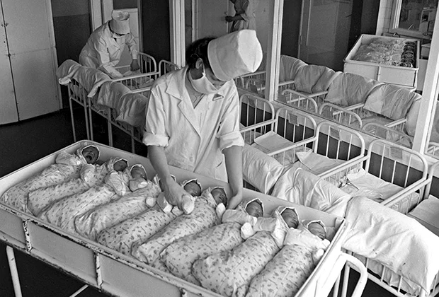 В те времена дети не находились вместе с мамами в палатах, а лежали в детском отделении. Мамашкам приносили их только на кормление. Каждые три часа слышно было из детского отделения как будили "пчелиный рой" - видимо перепеленовывали и складывали их штабелями на общие тележки, затем развозили по палатам наших ненаглядных малюток. Помню обходы врачей, которые орали на нас, чтобы мы расцеживали грудное молоко. Может с одной стороны это и правильно - никто практически не выходил из роддома без навыков грудного вскармливания. Не зря говорят, что роддом хуже армии. Кто не прошел - тот не знает настоящей жизни!!! В те времена это было особенно актуально.