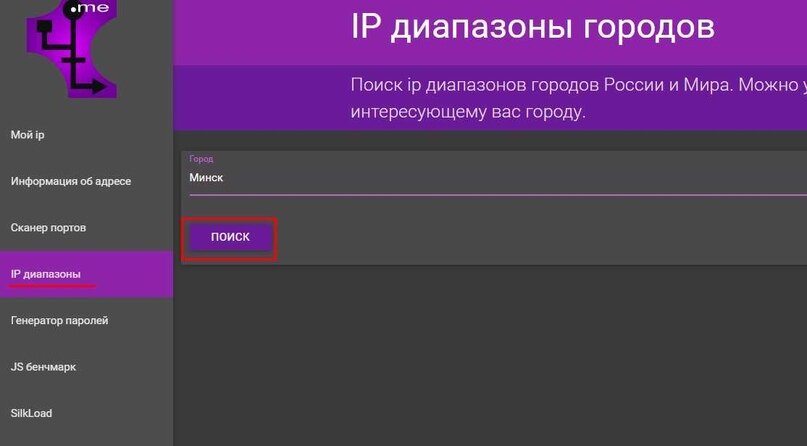 Итак, для начала нам нужны диапазоны ip нужного нам города. Переходим на сайт https://4it.me/getlistip , вводим название города.
