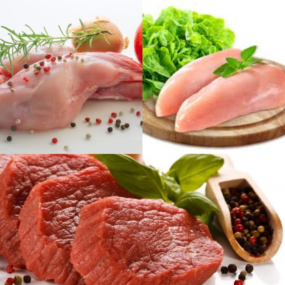 Говядина, птица, кролик, филе индейки, куриная грудка варёная/запечённая (без кожицы).