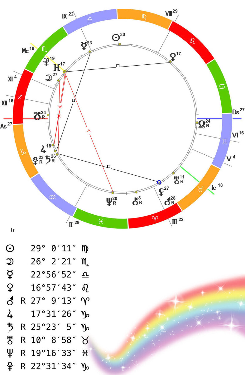 3. Определяем выделенный крест: Соотносим Знак Зодиака планеты и крест. В нашем примере: Солнце ☉ - в Деве (мутабельный крест) Луна ☽ - в Скорпионе (фиксированный крест) Меркурий ☿ - в Весах (кардинальный крест) Венера ♀ - во Льве (фиксированный крест) Марс ♂ - в Овне (кардинальный крест) Юпитер ♃ - в Козероге (кардинальный крест) Сатурн ♄ - в Козероге (кардинальный крест) Уран ♅ - в Тельце (фиксированный крест) Нептун ♆ - в Рыбах (мутабельный крест) Плутон ♇ - в Козероге (кардинальный крест)