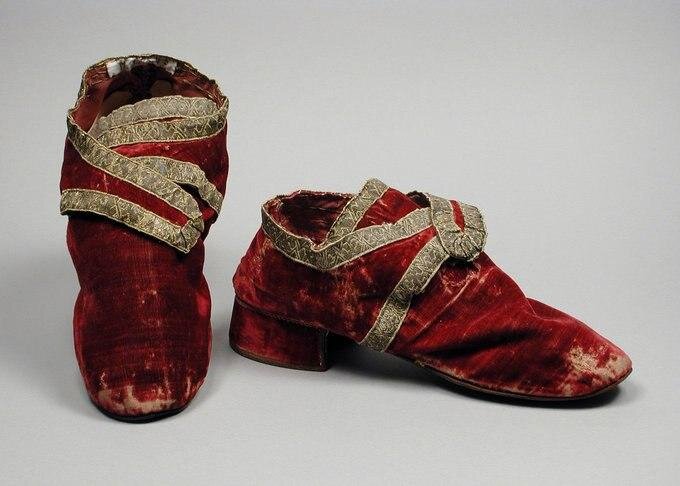 Предлагаю сравнить дорогую обувь из двух разных эпох: пару бархатных мужских туфелек с золотой отделкой из Италии 1730-х гг. в коллекции Лос-Анджелесского музея искусств и женский сапожок из скифского погребения на Алтае возрастом 2300 лет в собрании Эрмитажа.