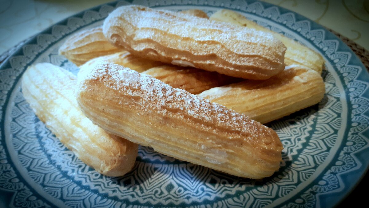 Эклеры -чудесные пирожные из заварного теста с начинкой из плотного сладкого крема. Нет ничего проще, чем приготовить их дома самим. Тесто: 250 мл воды 110 г сливочного масла 4–5 яиц 180 г муки ½ ч.л. соли Приготовление: Воду довести до кипения. Сюда же добавить масло и соль. Довести до кипения. В кипящую воду всыпать муку. Хорошо перемешать. Проварить около 2 минут, тщательно помешивая массу. Массу немного остудить. Поочерёдно добавить яйца, хорошо перемешивая. Противень застелить бумагой для выпечки. При помощи кондитерского мешка с насадкой выложить тесто в виде трубочек длиной 11–12 см. Поставить в разогретую до 180 градусов духовку. Выпекать в течение 10 минут. Затем температуру уменьшить до 150 градусов. Выпекать до золотистого цвета ещё около 10–15 минут. Готовые пирожные наполнить кремом при помощи кондитерского шприца. Рецепт заварного крема для пирожных: 1 стакан молока, 1 яйцо, 2 чайных ложки муки, 2 столовых ложки сахара, 50 гсливочного масла, ванильный сахар или лимонную ц