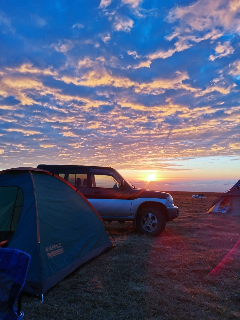 Мы с @koshon80 и @igorek.ff.79 отправились на плато, чтобы проводить закат и встретить рассвет, заночевав в палатке. Закат не удалось увидеть, по приезду было дождливо и хмуро. Ночью тучи прошли, светила луна, которая освещала Эльбрус. Ночевать было ооочень холодно, но оно того стоило. Проснувшись рано утром, мы развели костёр, нагрели чай и стали любоваться яркими красками рассвета.