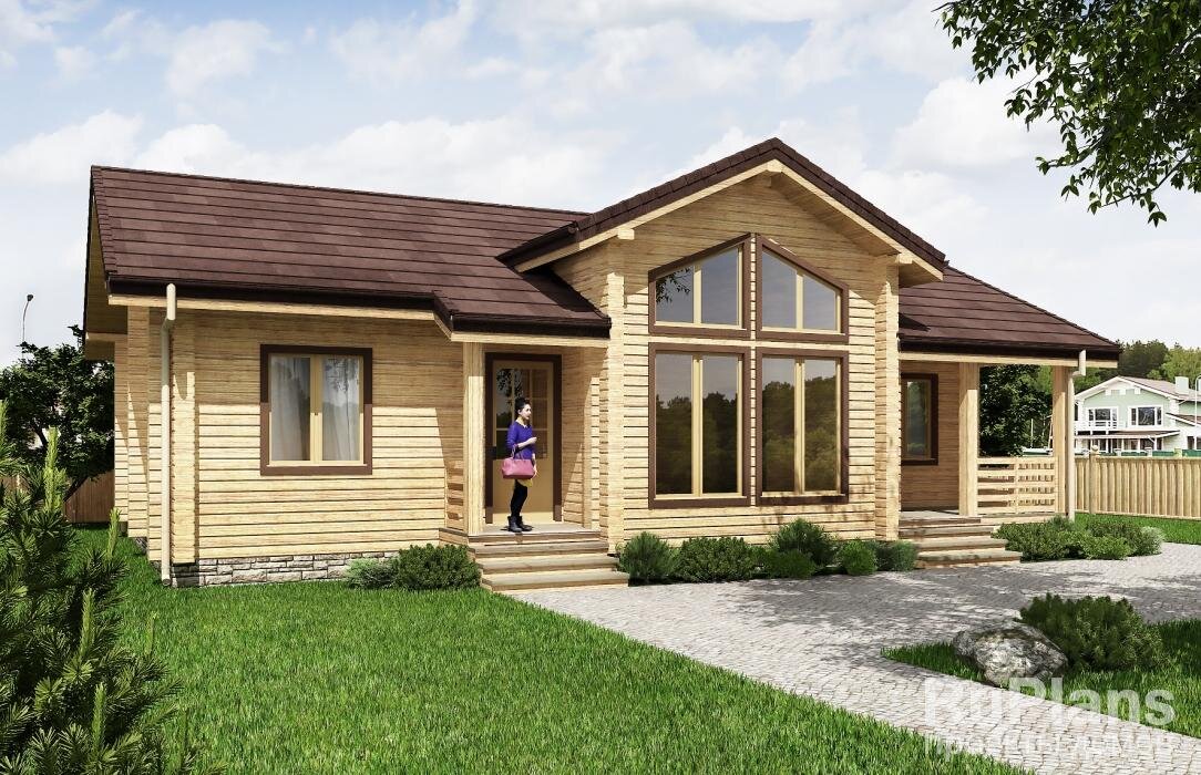 Проект Rg5636 представляет собой дом одноэтажный дом из бруса площадью 100 квадратных метров. Сложная форма крыши, брус без отделки, эркер с панорамными окнами терраса - всё это придаёт дому привлекательный внешний вид.