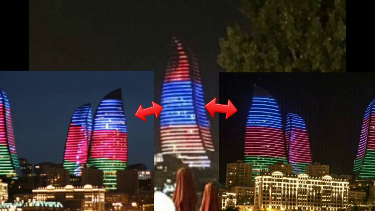 В сети появились фотографии известных в Баку «Пламенных башен», окрашенных в цвета армянского флага – красный, синий и оранжевый.