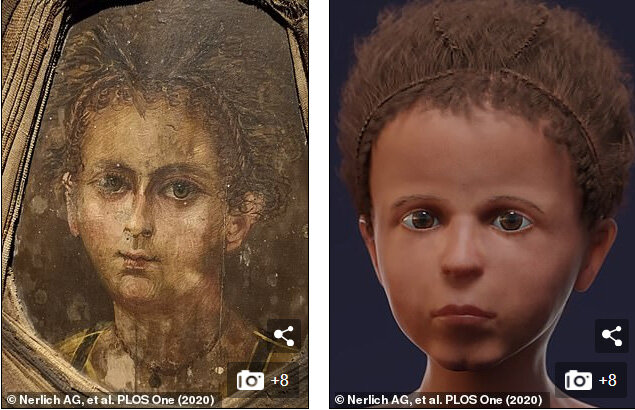 «Портрет мумии» был найден на древнеегипетской шкатулке, принадлежавшей мальчику, умершему между 50 г. до н.э. и 100 г. н.э., и исследователи решили проверить, насколько он соответствует его настоящему лицу. Используя компьютерный томограф, команда загрузила виртуальную конструкцию черепа ребенка, все еще находящегося в могиле, чтобы создать трехмерную цифровую реконструкцию его лица. Изображение реконструкции лица довольно точно соответствует оригиналу, но исследователи отмечают, что картина заставляет ребенка выглядеть намного старше, чем его трех- или четырехлетний ребенок. Другие различия включают ширину переносицы носа и размер ротового отверстия, причем оба изображения на портрете более тонкие и «узкие», чем виртуальная реконструкция. Портреты мумий были обычной практикой среди некоторых египтян в греко-римские времена. Картина была помещена на забальзамированное лицо в соответствии с римской традицией, в то время как остальная часть тела была обмотана льняными бинтами, что соотв