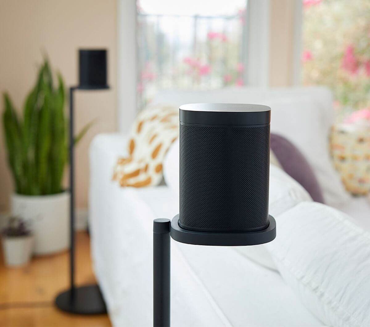 Стойки окрашены в тот же цвет, что и колонки Sonos — белый или черный. Когда динамики установлены на площадки, создается впечатление, что аксессуар и акустика — единое целое.