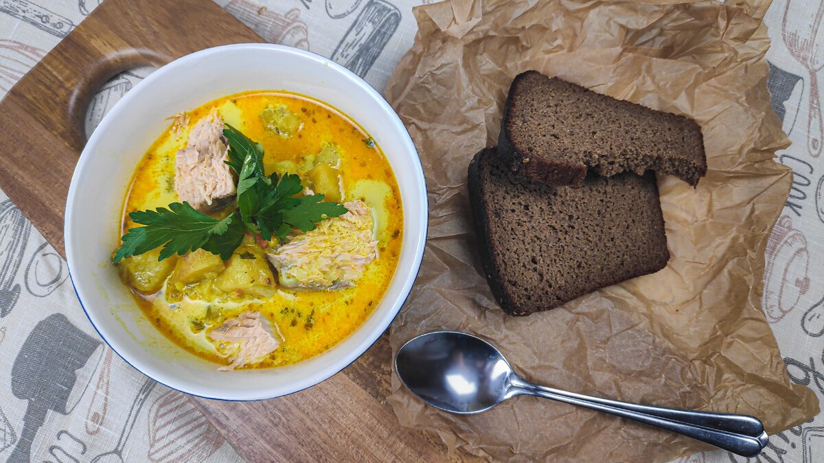 Подаем густой чаудер с кусочками рыбы от сваренного хвоста и свежей зеленью.