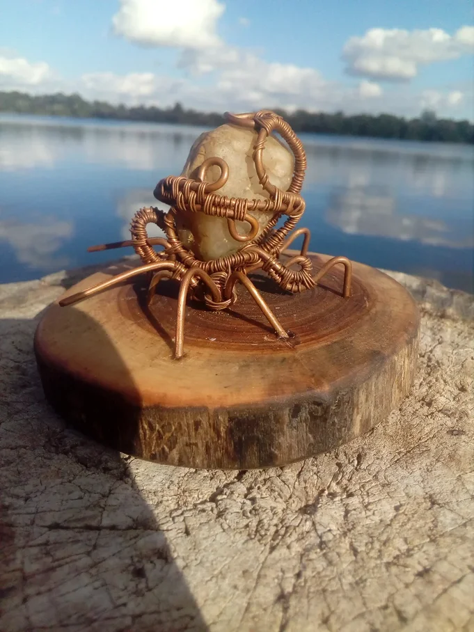 Статуэтка выполнена из меди с применением осколка молочного кварца в технике "wire wrap". Установлена на постамент из морёной осины, пропитанный для защиты от влаги льняным маслом.