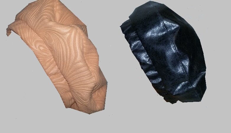 Чёрный берет из стрейчевой ткани «под кожу». Эта ткань холодная, поэтому для подклада я использовала мягкий тонкий флис. Другой берет (назовём его коралловым) тоже из флиса, но толстого, и на подклад я взяла обычную вискозную ткань. Флис настолько толстый, что подклад я пришивала вручную.