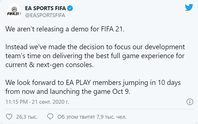 Дорогие любители виртуального футбола - у меня для вас плохие новости. Вчера EA на официальном канале в твиттере заявили, что в этом году демоверсией нас не порадуют. Давайте подумаем, что это может значить?