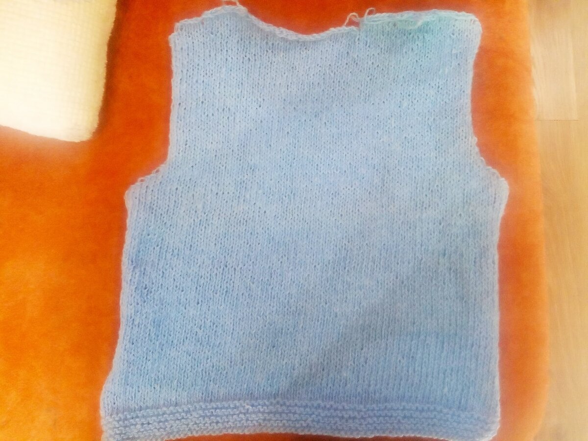 Продолжаем вязать спинку. Через 27 см от начала закрыть с 2-х сторон для пройм 1х3 п., затем в каждом следующем 2 ряду 1х2 п. 1х1 п. На спицах 59 п. Далее вязать прямо, через 44 см от начала закрыть с обеих сторон для плеч 1х2 п., затем в каждом следующем 2-м ряду 3х4 п., одновременно с 1-й убавкой для плеч закрыть для горловины средние 11 петель и бе стороны вязать отдельно. с внутренней стороны