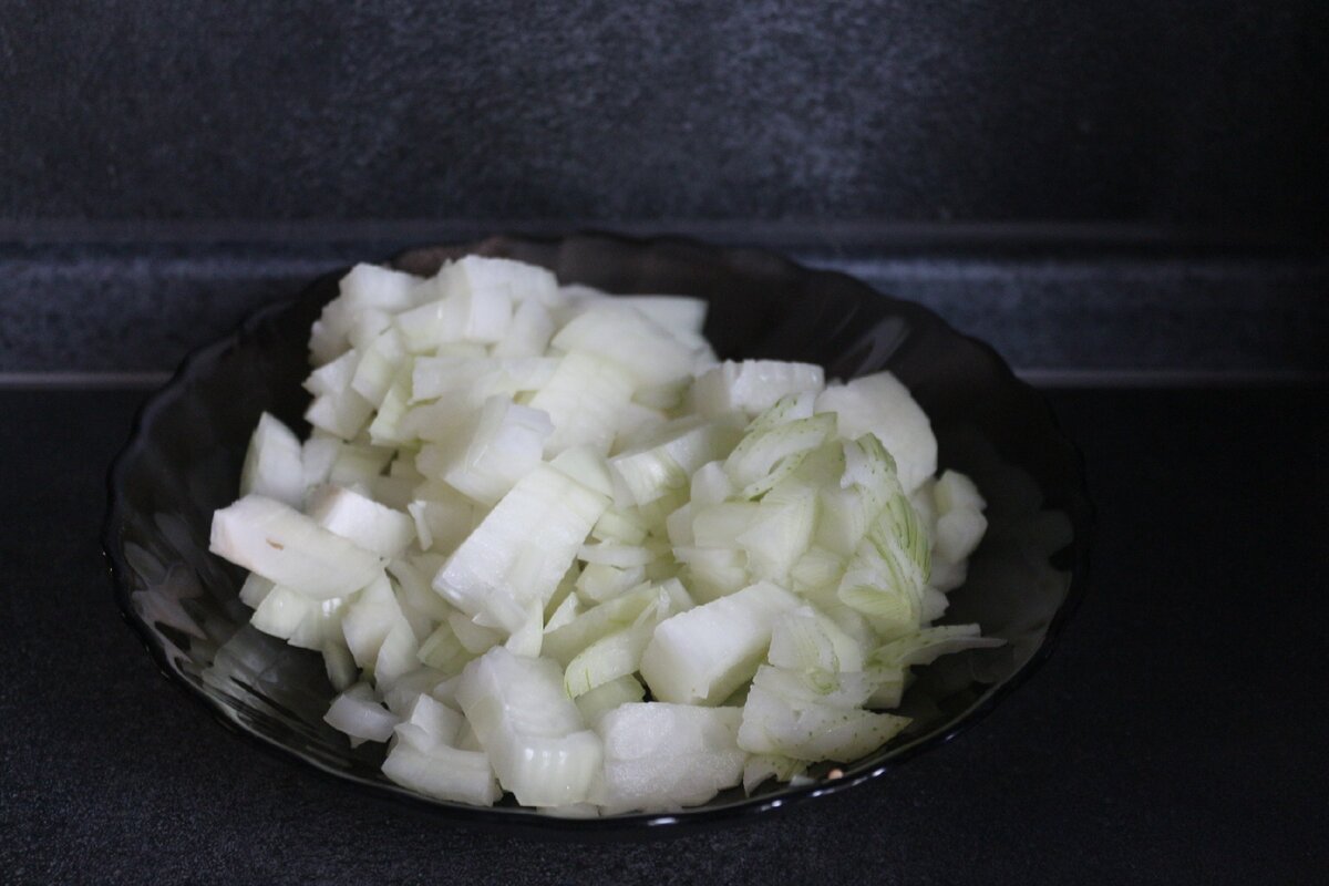 Лук режем крупными кубиками и отправляем на раскаленную сковороду с небольшим количеством масла.