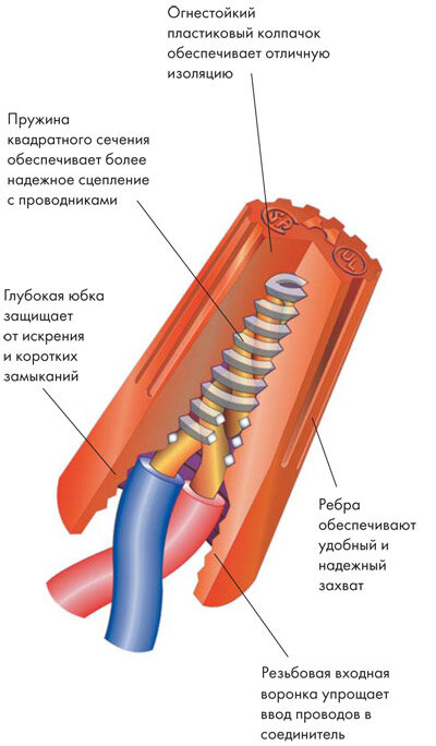 Соединительные изолирующие зажимы (СИЗ) представляют собой конус из изолирующего пластика с металлической вставкой внутри (рис. 1). Два или более очищенных от изоляции электрических провода вставляются до упора в зажим СИЗ, который затем закручивается вручную, создавая надежный механический и электрический контакт проводов. Отличительной особенностью зажимов СИЗ компании Heavy Power является стальная оцинкованная невыпадающая пружина квадратного сечения для соединения проводов скруткой. Корпус соответствует американской противопожарной норме UL 94V-2, то есть выдерживает температуры до +105 °С.