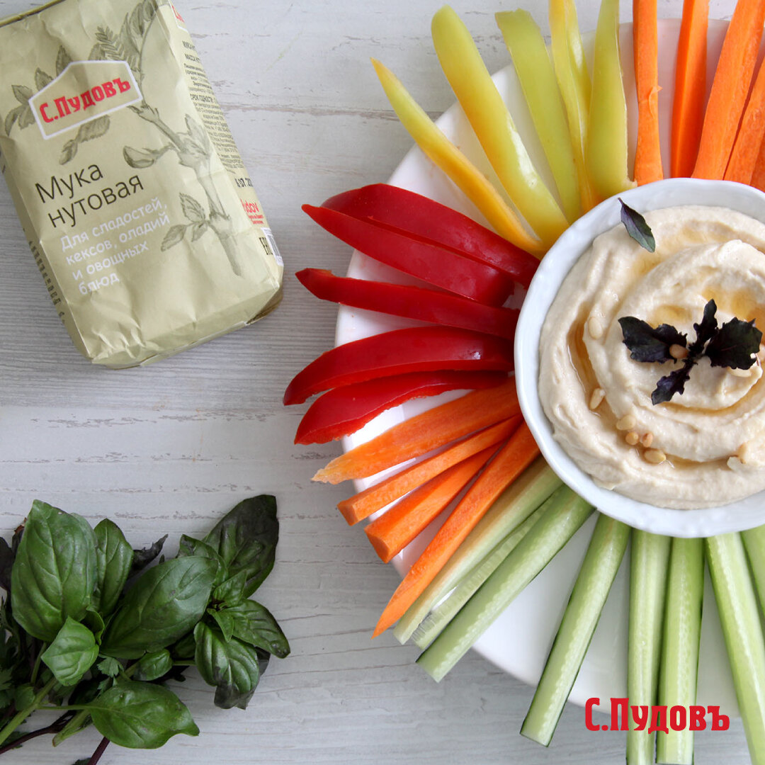 Нежная закуска из нутового пюре с легким ароматом чеснока, лимона и кунжута. Подходит для бутербродов, как аккомпанемент к овощной нарезке или в качестве начинки для тарталеток. В этом классическом рецепте приготовления хумуса в домашних условиях используется нутовая мука – благодаря ей закуска готовится быстро, паста получается воздушной и однородной.