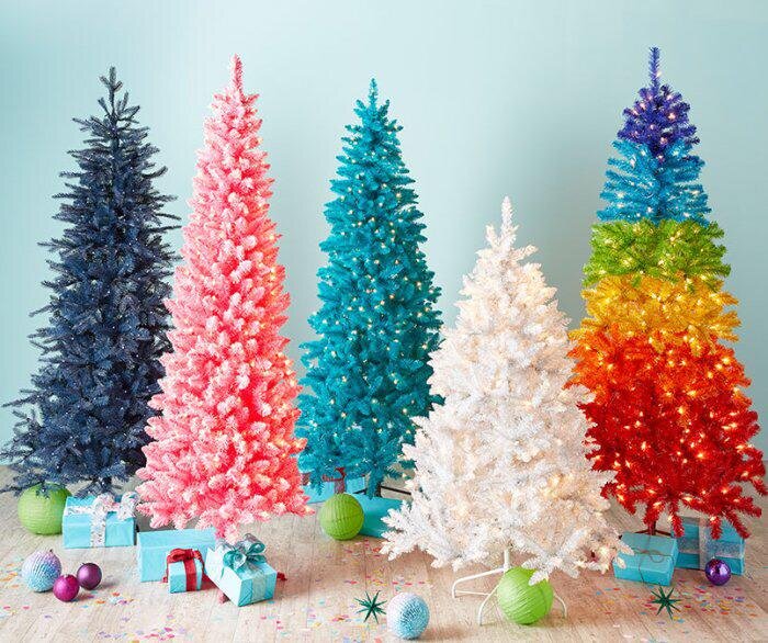 Помимо классических зелёных новогодних деревьев, очень популярны елочки с напылением из искусственного снега.