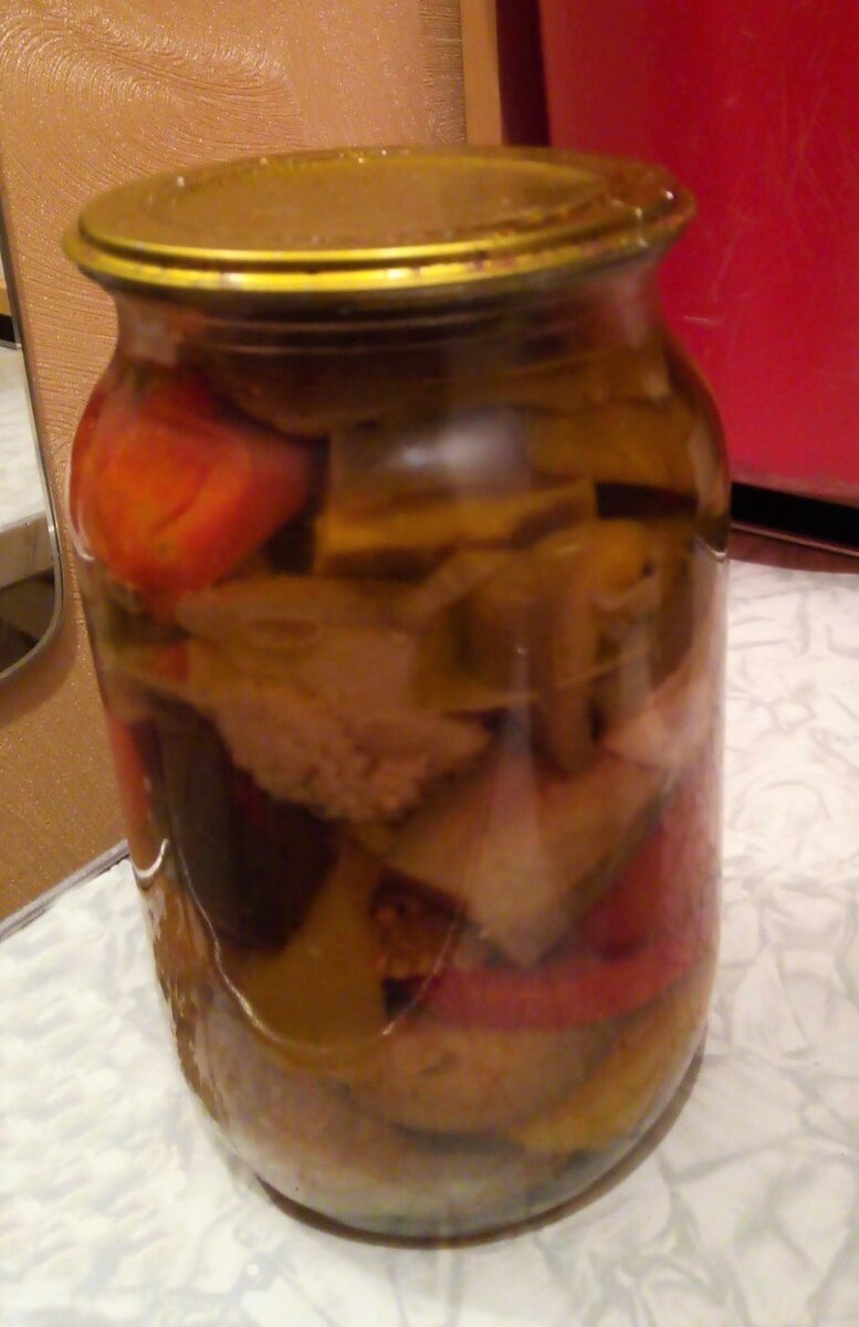помидоры мелкие, средние 10-15 шт., баклажаны 10 шт.,. лук 10шт., чеснок 10 зубчиков, перец красный сладкий 10 шт., перец острый 1 - 2 шт. асло подсолнечное 0, 5 л., Уксус 3 ст. л., Сахар 1 стакан, Соль 0,5 стак., Подготовить овощи : овощи помыть, почистить, баклажаны обрезать с двух сторон. Овощи, кроме помидор, могут быть целые или резанные , сложить в кастрюлю в следующем порядке баклажаны, перец, лук, чеснок, помидоры, уксус, масло, соль, сахар. Овощи тушить 40 мин., разложить в литровые банки и закатать, не стерилизовать. Укутать до остывания.