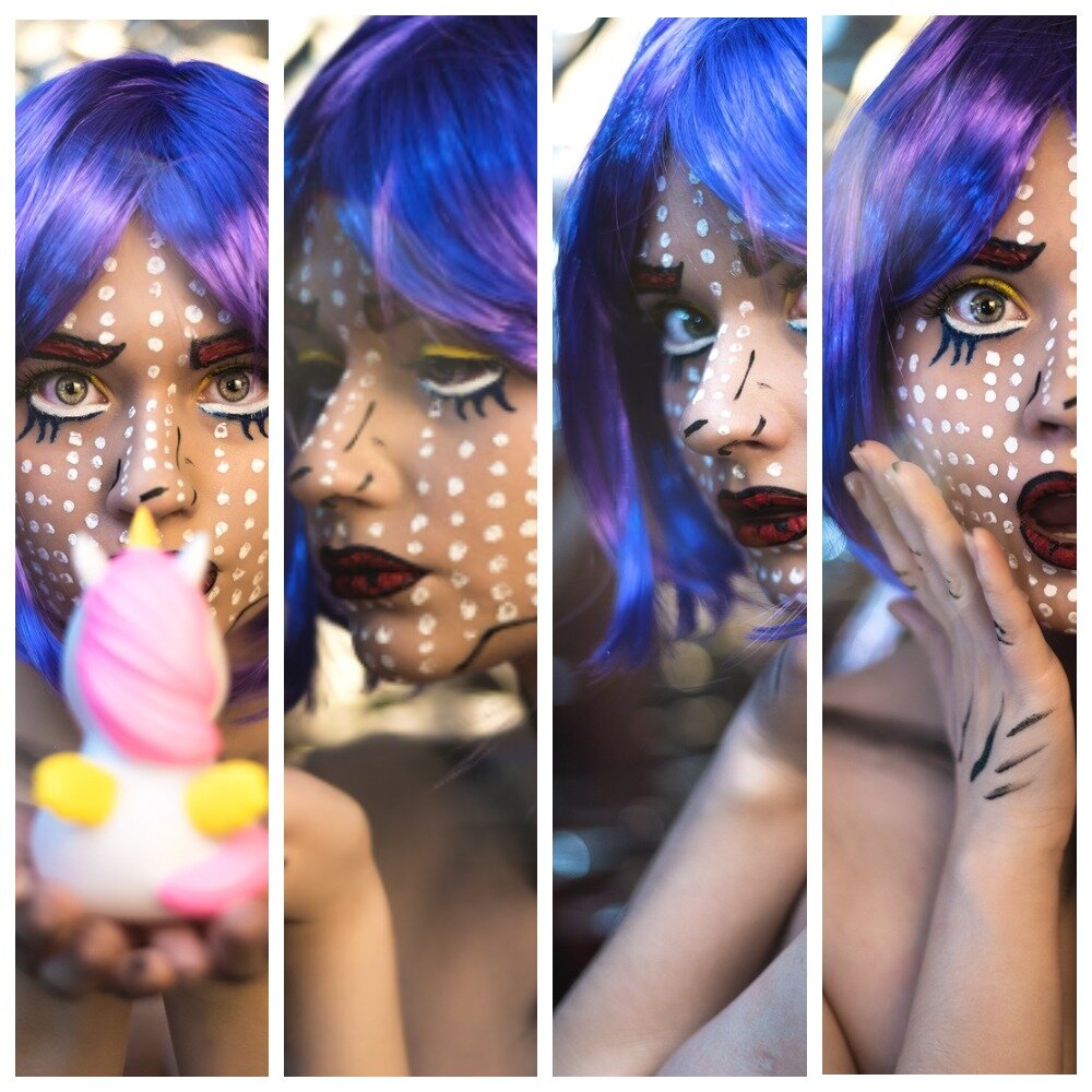 Мы снова на связи ! Почти досмотрели сериал "Готэм" советуем всем, кто хотя бы частично знаком со вселенной DC. В сериале не только качественное раскрытие персонажей, но и хорошая сюжетная линия. В первых сезонах даже можно сказать отличный детектив. НО просто смотреть сериалы - это не про нас. Поэтому мы устроили дома маленькую студию. 1. На шкаф повесили "фон" шторка-фольга для окон. Думаю подойдет и просто рулон фольги ( на кухне посмотрите, по-любому есть в шкафу.) 2. В "Галамарте" купили парик (самый простой парик) 150-200 руб. Качество парика исправит фон и правильно поставленный софт бокс. Да и для "девушки из комикса" не нужна ухоженная и натуральная коса. 3. Дорогой и любимый "Фикс Прайс" ( где уже откат за рекламу ??) Купили там гуашь детскую, самую обычную. 55 руб цена вопроса 4. Заходим на Pinterest, пишем: "Поп-арт, комиксы или что-то тому подобное". Выбираем макияж который вам по душе, ну и по умению. 5. Кисти + краска + нервы + тональник + крем (жирный) + время (прим