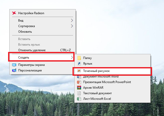 Дальше, компьютер сохраняет изображение экрана во временное хранилище. Чтобы достать изображение из хранилища, Вам нужно нажать в любом месте рабочего стола правую кнопку мыши и выбрать пункт "Создать", подпункт "Точечный рисунок":