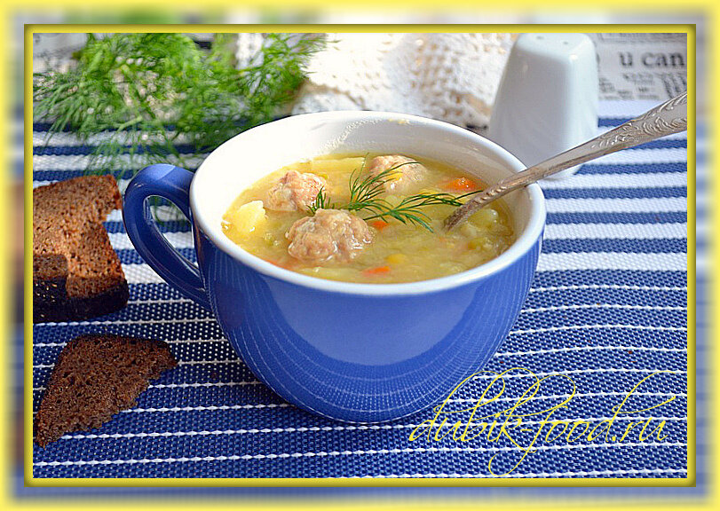 Суп с фрикадельками - совершенно простой домашний суп, на приготовление которого понадобится совсем немного времени. А если у вас имеется смесь бобовых ( два вида гороха и красная чечевица ), то это проще вдвойне. Готовьте, и густой, наваристый, ароматный и сытный супчик порадует вашу семью!