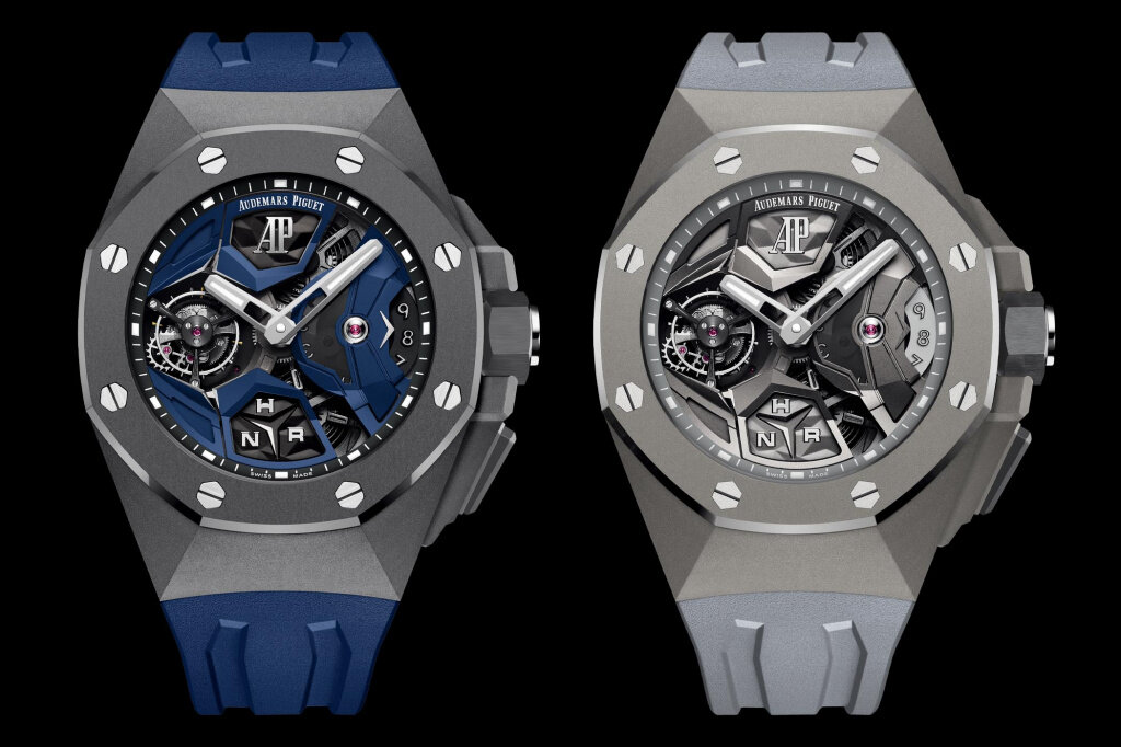 Модель Royal Oak Concept Flying Tourbillon GMT дебютировала два года назад в версии с титановым корпусом с пескоструйной обработкой и матовым черным керамическим безелем. Последние модели имеют точно такие же характеристики, но представлены в новой цветовой гамме: одна выполнена в однотонных серых тонах, а другая - с яркими синими акцентами.