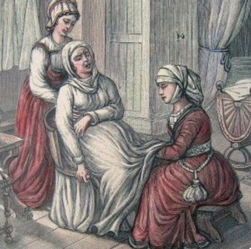 - Принимать роды следовало опытной повитухе – это всегда была зрелая матрона, многодетная мать, получившая свои знания либо по наследству, либо от прежней знахарки. Те, кто мог это себе позволить, платили повитухе загодя, чтобы та в последние дни до предполагаемого времени родов, неотлучно находилась при беременной, и подключалась немедля, как только требовалась ее помощь.