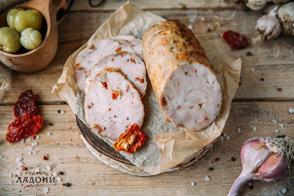 Ингредиенты для колбасы из птицы с вялеными помидорами: Подготовка Половину мяса с бедер нарезать кубиками, а остальное измельчить (вырезал в основном части с кусочками жира) на мясорубке. Мясо (фарш и нарезку) выложить в миску, добавить вяленые помидоры, нарезанные кубиками, маринованную соль и специи. Месите все вручную около 8-10 минут, пока мясо не станет липким. Оберните мясо фольгой и уберите в холодильник примерно на 24 часа. По истечении этого времени добавьте растворенный в горячей воде желатин и еще раз месите рукой несколько минут. Затем поместите в ветчину пакет из фольги (предназначенный для этого) и, прижав его, наполните его мясом. Оберните пакет, чтобы внутри не было воздуха, и закройте ветчину. Ставим в холодильник примерно на 3-4 часа. По истечении этого времени поместите ветчинку в кастрюлю с водой с температурой 80 C. Уровень воды должен быть примерно на 2 см выше мяса в ветчинке. Варим колбасу примерно 2,5 часа, следя за тем, чтобы температура воды оставалась на п
