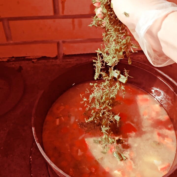 Проварил еще суп минут 15, довел его до вкуса специями. И в кульминации отправил всю зелень в казан. И с криком «ОБЕД ГОТОВ» позвал нас к столу!