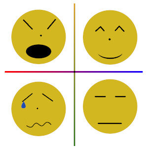Давайте нарисуем самую обычную горизонтальную шкалу, один край пометим "психически нестабилен", а другой "психически стабилен". В середине пересечём эту шкалу другой, вертикальной, на которой будет с одной стороны отмечено "экстраверт", а с другой "интроверт". Таким образом на полученной плоскости каждому человеку соответствует некоторая точка, лежащая в одной из четырёх зон, разделённых шкалами. Эти зоны соответствуют четырём темпераментами следующим образом: