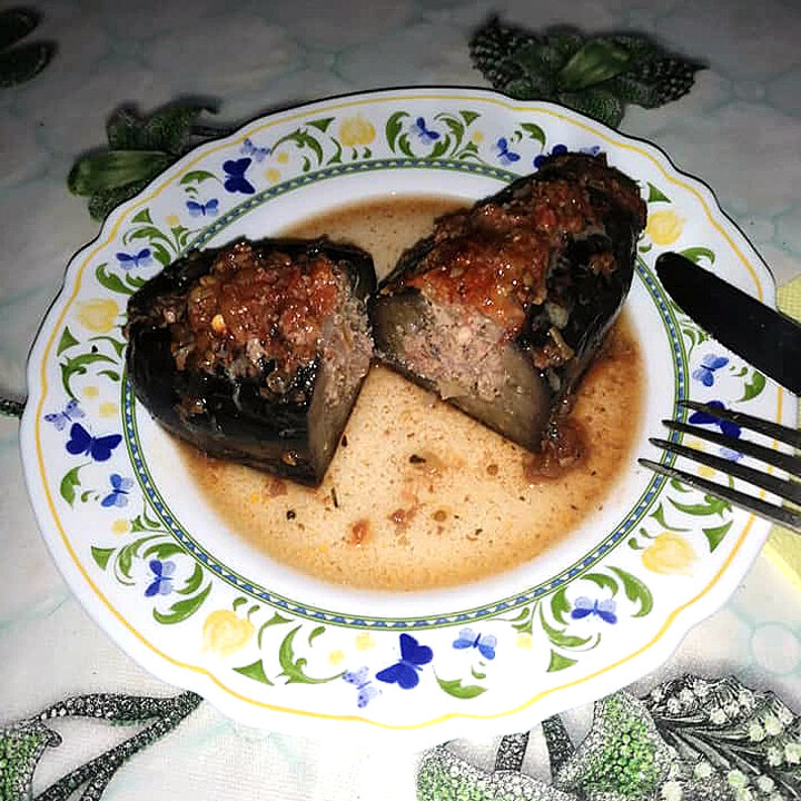 Пока фарш стоит и вбирает в себя все ароматы овощей и приправ, подготавливаем баклажаны. Они должны быть целые, хвосты не рубим.