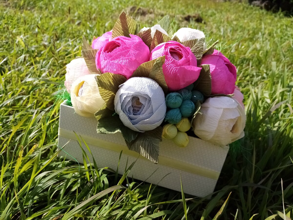 Первые мои букеты улетали в мусорку. Но мне очень хотелось получать достойные цветы. Я тратила свою зарплату на материалы: гофрированную бумагу, сизаль, конфеты, чай, клеевые стержни, атласные ленты и т.п.