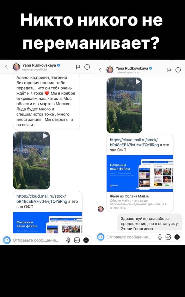 Эти слова сегодня появились в сториз в Instagram группы Тутберидзе вместе со скринами переписки Загитовой и Яны Рудковской, которая является супругой Евгения Плющенко.