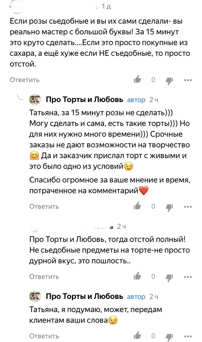 В декоре торта мы используем шоколад, безе, мастику по желанию клиента, пряники, ягоды, живые цветы, вафельные цветы, леденцы. И я совсем не понимаю, что из этого «Фу!».