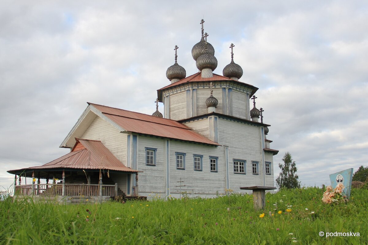 Всех приезжающих встречает красивый деревянный храм, та самая уцелевшая часть погоста. Это Богоявленская церковь, признанная, и абсолютно заслуженно, шедевром деревянного зодчества. Жемчужина Русского Севера. Настоящее чудо, сумевшее устоять и дожить до наших дней. До 2013 года рядом стояли ещё одна деревянная церковь и колокольня. Красивые, уникальные, с небесами потрясающими. Но на Пасху в них ударила молния, пожар не пощадил Покровско-Власьевскую церковь, следом вспыхнула колокольня. Богоявленский храм чудом удалось спасти. Местные жители, рискуя жизнью, смогли вынести некоторые иконы из горящей церкви и отстояли соседнюю. За это им огромная благодарность. Церковь необыкновенная, но о ней отдельно рассказывать надо.