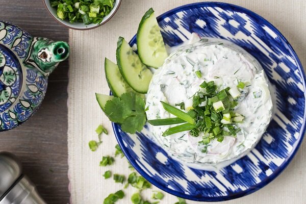 С развитием овощеводства и садоводства в Башкирии, а также благодаря общению башкирской нации с другими народами, населяющими Башкирию, национальная башкирская кухня стала намного богаче и разнообразнее. Если раньше башкиры употребляли в качестве холодных закусок домашнюю колбасу (казылык), отварное мясо конины, баранины, говядины, птицы домашней и дичь, то сейчас на столе можно встретить богатый ассортимент закусок из различных овощей. Салат из зелени с сюзьмой Что такое сюзьма? В переводе с тюркского это слово означает "сцеженный". Если катык процедить от лишней жидкости получится сюзьма. Лук зелёный - 250 г, листья салата - 100 г, свежие огурцы - 150 г, укроп - 20-30 г, сюзьма - 200-250 г, соль, перец по вкусу. Молодой зелёный лук, листья салата, укроп, свежие огурцы мелко нарезать и перемешать. Растереть сюзьму и развести её кипячёной водой до густоты сметаны. Зелень заправить полученной сюзтмой, посолить, поперчить по вкусу и выложить в салатник. Салат из редьки Редика - 200-250 г