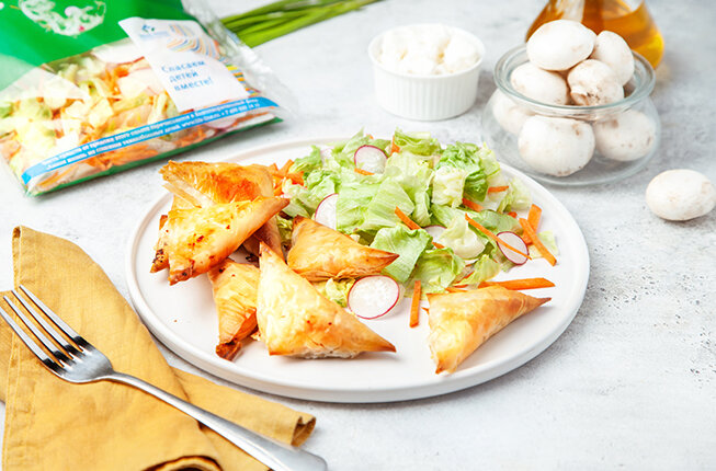 На тарелку кладем конвертики. Рядом – Весенний микс “Белая Дача”. Поливаем салат 1 ч. л. раст. масла и посыпаем чуть-чуть солью.⠀