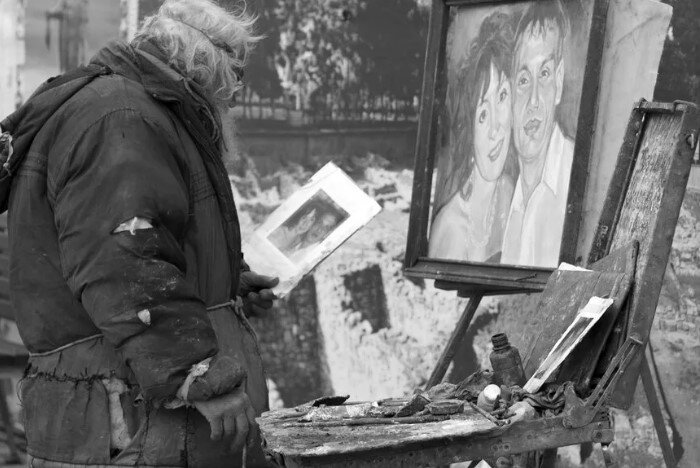 Другие воспринимают бедность как свободу, ведь если художник отдает всего себя живописи, не утруждая банальной и рутинной работой на рынок, то у него гораздо больше времени для экспериментов и собственно живописи. Пабло Пикассо говорил, что «вдохновение существует и приходит во время работы». То есть не стоит лежа на диване ожидать прихода музы, которая за руку поведет к холсту и позволит нарисовать шедевр на миллионы.