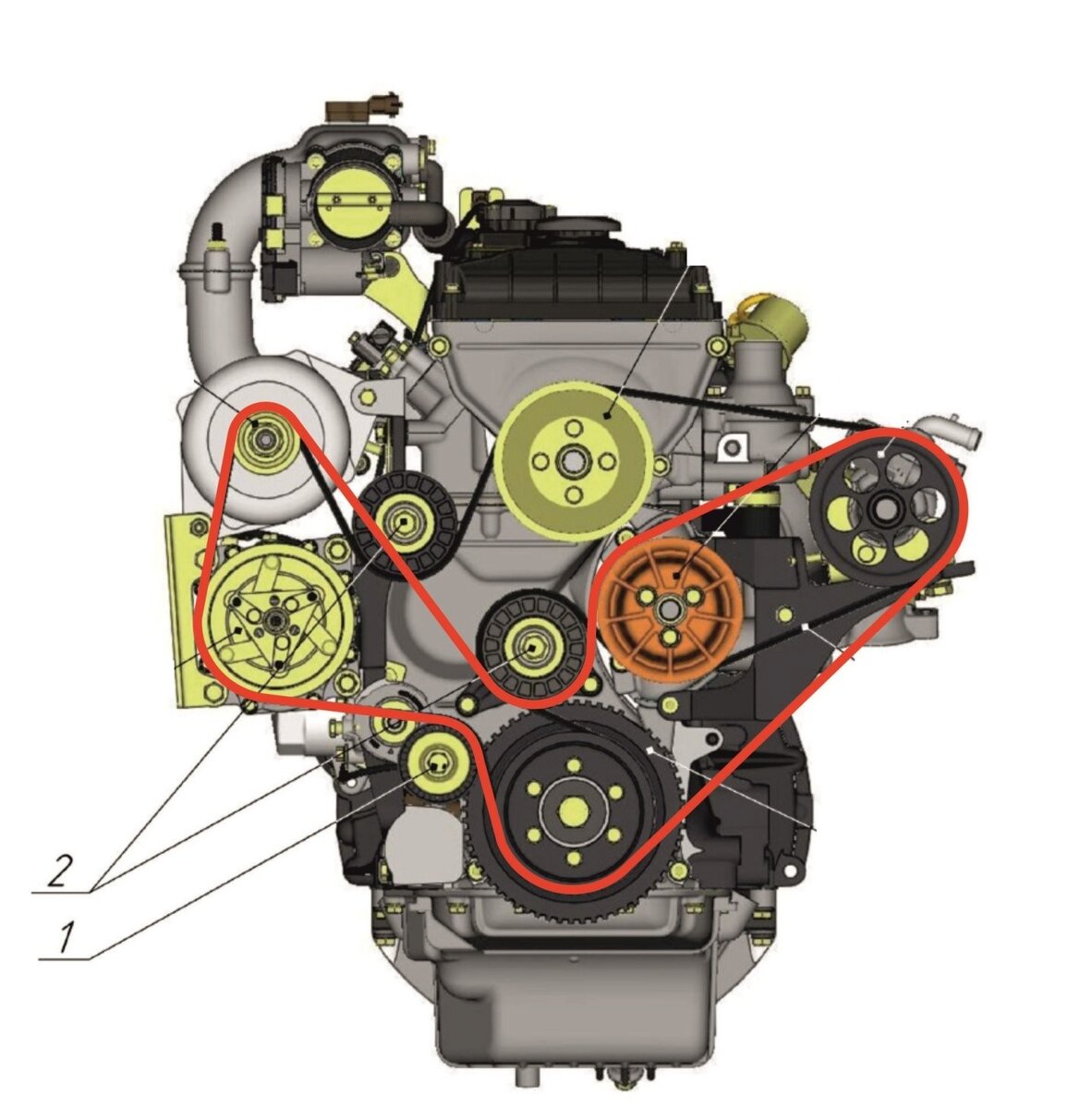 Схемы привода агрегатов различаются конструктивными решениями, в качестве примера рассмотрим схему привода двигателя ЗМЗ 409 евро 3. Цифрой 1 показан механизм натяжения и его ролик, цифрой 2 показаны обводные ролики.
