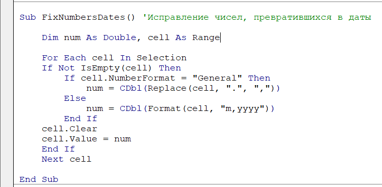 Sub FixNumbersDates() 'Исправление чисел, превратившихся в даты