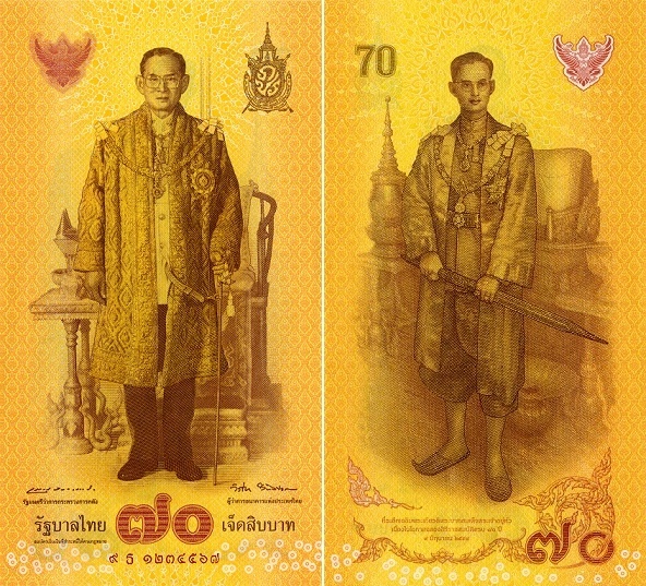 1. 70 тайских бат. Памятная банкнота, посвященная 70-летию вступления на престол короля Таиланда Пхумипона Адульядета.