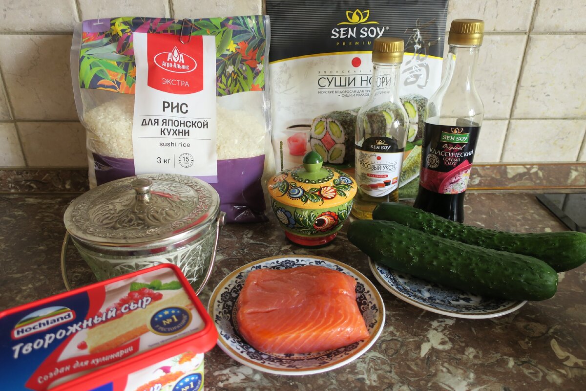 Огурец нарезаем тонкой соломкой, рыбку — пластинками. Обычно куска рыбы 300 грамм хватает на два обеда для троих. В первый день рыбка в роллах внутри в виде полосок, на второй день рыбка в виде пластинок на роллах сверху (ролл Филадельфия, упрощенный вариант, готовим сейчас).