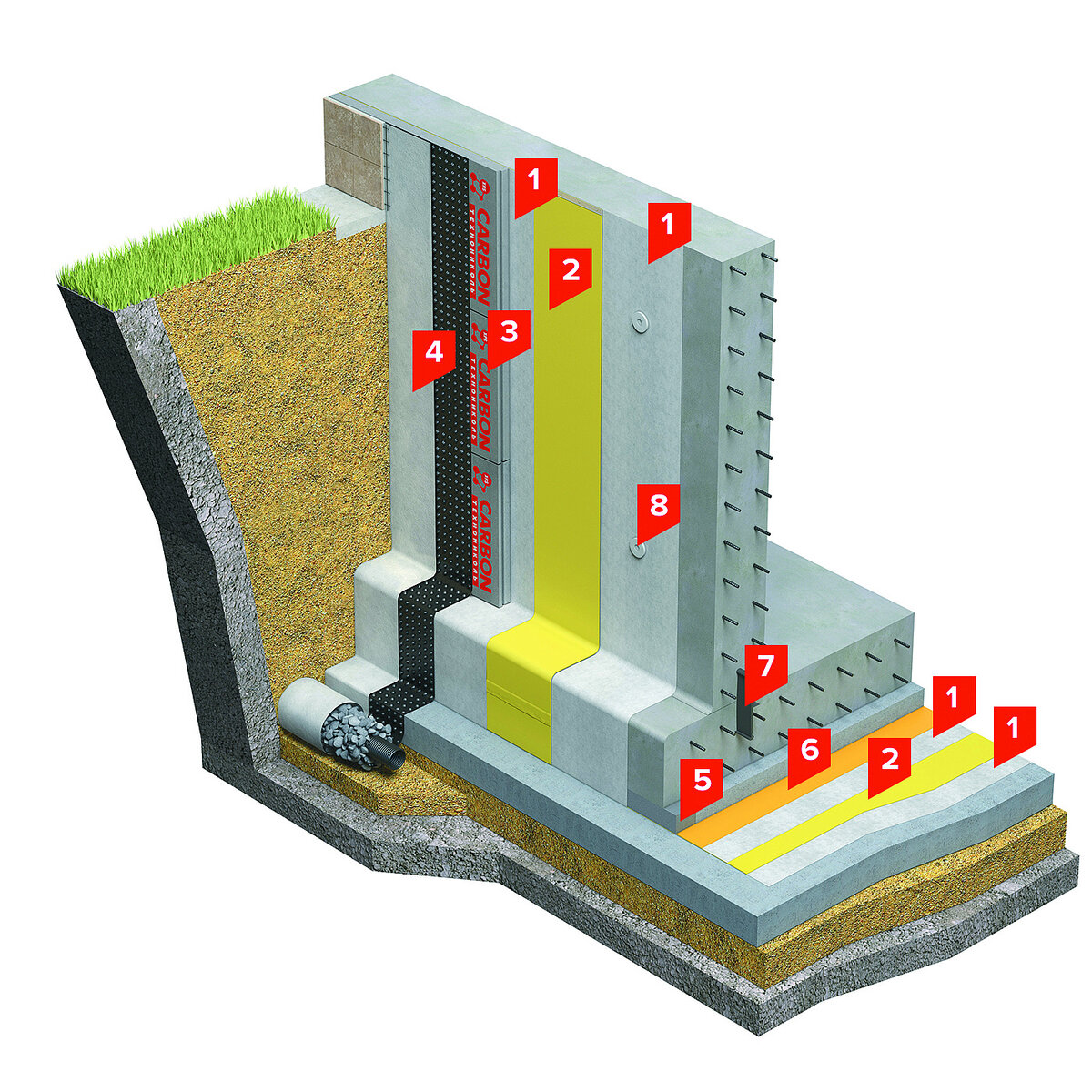 Участок у нас имеет уклон в сторону дома. Подвальный этаж засыпан землей на 2 метра. Грунт суглинок с камнями. Для отвода воды решено воспользоваться технологией гидроизоляции фундамента одной известной фирмы. Поясню по рисунку: 1 это обмазочная гидроизоляция(грунтовка), 2 это битумная рулонная гидроизоляция, с промазкой швов мастикой. 3 утеплитель ЭППС, приклееный на пену-клей. Для тех кто будет делать рекомендую подготовить плоскость стены. Любая неровность будет служить сосудом для воздуха. 4 это профилированная мембрана(на рисунке черная с точками). Геотекстиль не делал. По контуру рядом с фундаментными подушками проложил дренажную трубу. О порядке монтажа расскажу в следующей статье. Поверх всего пирога гидроизоляции и утеплителя закрепил мембрану. Крепил профилированную мембрану на так называемые "грибы" для ЭППС. Примерно также выглядит и у меня, частично мембрана вышла наружу. При этом УФ-излучение от солнца ее ни как не потрепало. Единственное при засыпке и последующей усадке
