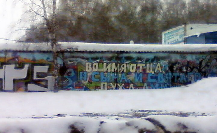 Одно из первых подобных изображений встретил уже довольно давно на одной из гаражных стен в подмосковных Химках. Это была просто надпись в стиле граффити, которая по существу является началом и завершением православных молитв и богослужений, т.е. имеющая сакральное значение: "Во имя Отца, и Сына, и Святаго Духа. Аминь".