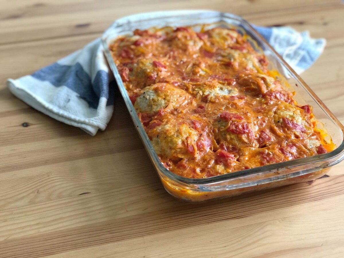 - Фарш смешать с луком, рисом, яйцом, солью и перцем. Добавить сухари и ещё раз перемешать. Мокрыми руками сформировать тефтели, выложить в форму, залить овощной смесью.