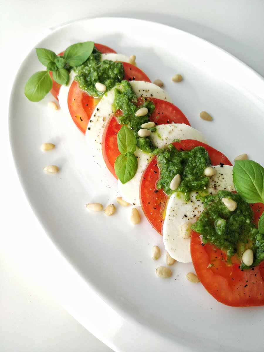 Вместо соуса Песто можно сбрызнуть салат Капрезе оливковым маслом (2 ст.л.) и бальзамическим уксусом (1 ч.л.)
