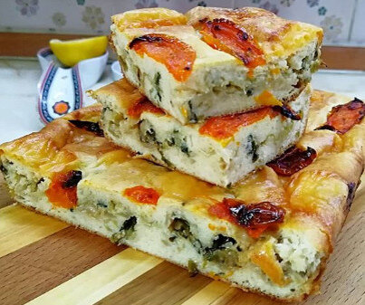 Форму смазываем маслом и выливаем половину теста, выкладываем начинку, заливаем остатками теста. Сверху кладем кусочки сыра и вяленые помидоры, чуть присаливаем.