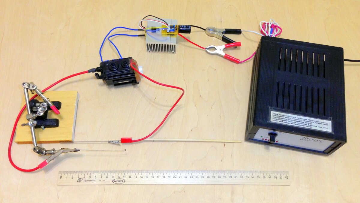High Power 555 Flyback Driver в основе схемы лежит микросхема таймер NE555 и полевой транзистор IRF630A Коронный разряд образуется на расстоянии 10 см., дуга зажигается с 4-5 см. Группа VK: https://vk.com/club126145973 Заходим не стесняемся, в группе публикуется много интересных схем. Транзистор IRF630A Блок питани 14.6V 3A Выход с ТДКС- 60-70kV Транзистор установлен на массивный радиатор. Спасибо за внимание.