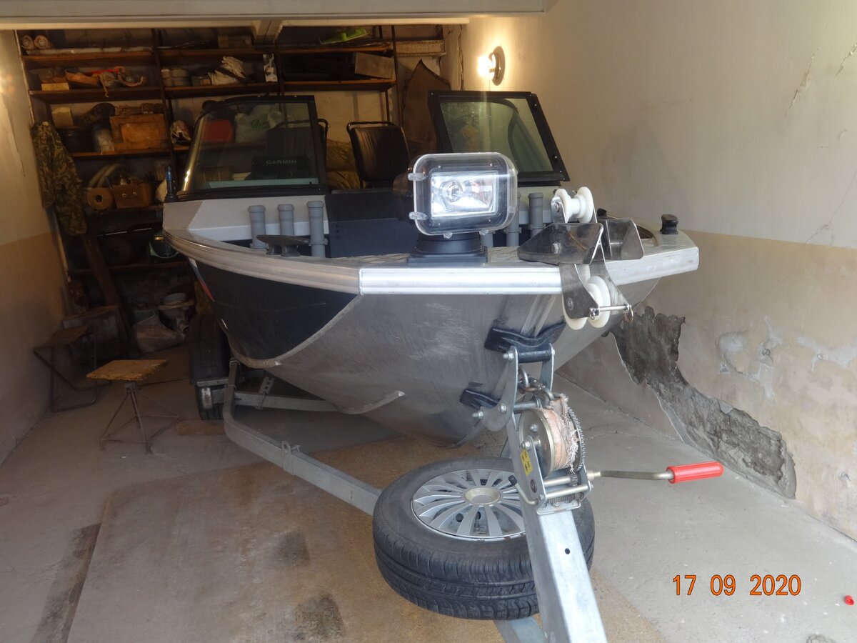 Поставили лодку на прицеп МЗСА, добавив запасное колесо, и заменив лампы стоповых огней на светодиодные лампы, что позволяет спускать на" слип" в темноте при включенных габаритах, что очень облегчает попадание в "слани" прицепа.