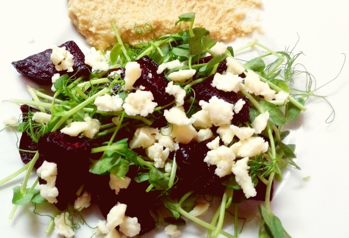 - Сбоку тарелки выкладываем соус, кладем зелень (салат), кусочки свеклы, сверху еще пару веточек зелени (салата), посыпаем фетой (в моем варианте козьим сыром).
